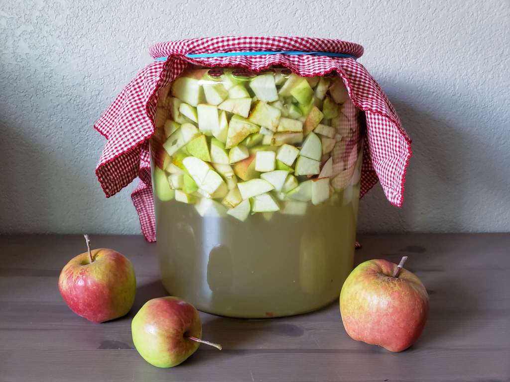 5. Leave it to sit at a cool place for 6 weeks but stir for 30 seconds each day for the first 10 to 12 days to prevent the apples on the surface of the solution from drying.